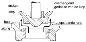| Bij het berekenen van de belasting op het veiligheidstoestel wordt aangenomen dat de werkdruk P tegen de klep een druk uitoefent op een oppervlak begrensd door een cirkel, waarvan de middellijn 2mm groter is dan die van de klepopening.