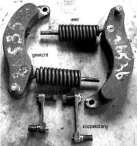 De beveiliging van onze machine bestaat uit een schijf met gewichten, gemonteerd op de krukas. Deze gewichten zijn via een veer aan de schijf bevestigd. Deze veren zijn met een moer op spanning gebracht, de spanning bepaalt op welk toerental de gewichten geheel zullen uitslaan. Bij ons is dat bij 200 toeren. De beveiliging bestaat verder uit een tweetal in elkaar draaiende excentrieken, het ene wordt ingesteld door de regulateur aan de hand van het toerental, de ander door de verstelinrichting. De excentrieken samen bepalen de uitslag van de stang naar de nokken en regelen daarmee de lichthoogte en openingstijd van de kleppen.